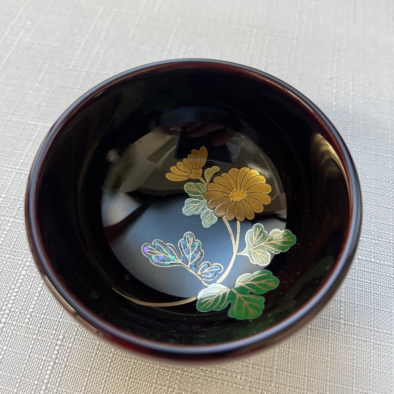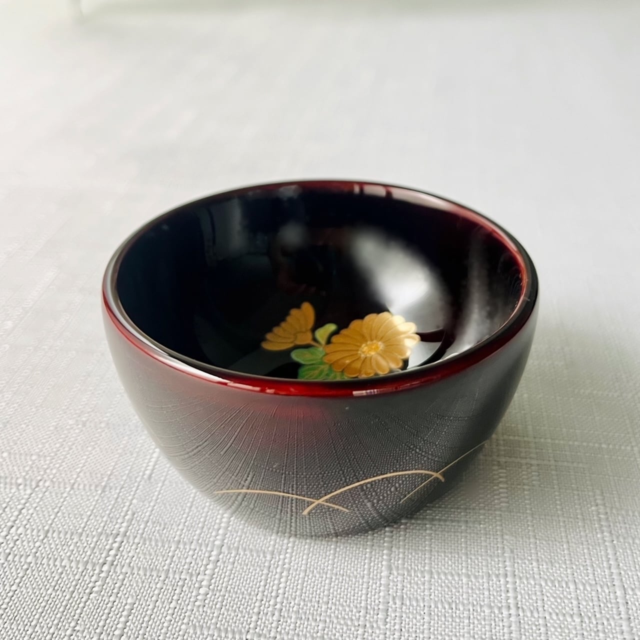 深い溜塗に、陽の光を浴びて輝くような金の菊花が美しい、輪島塗ならではの酒器。