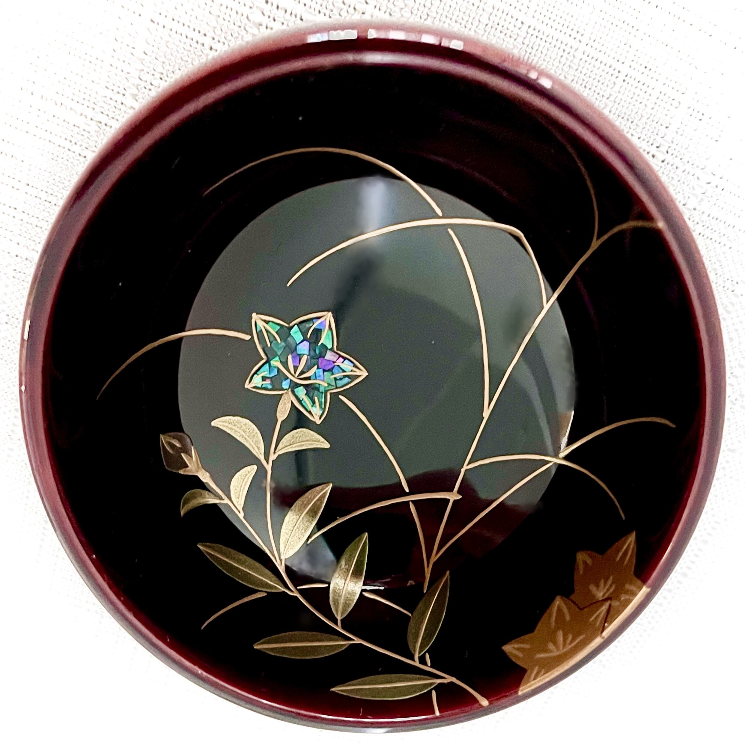 蒔絵は万葉集に詠まれる秋の七草のひとつ『桔梗(ききょう)』。野に咲く可憐な花が、螺鈿や金の蒔絵で描かれています。